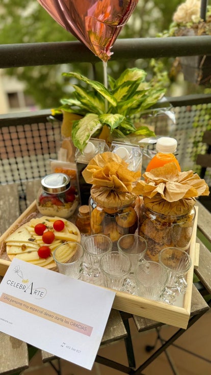 Sorprende a tus colegas de trabajo, tus amistades o familiares con este delicioso desayuno para 6 personas. Incluye: café, leche fresca, 1L de zumo de naranja, pastas dulces y saladas, smoothie bowl de cereales, frutos secos, frutas y miel, tabla de quesos (4 variedades) una planta, globo y tarjeta de mensaje. Precio desde 45€